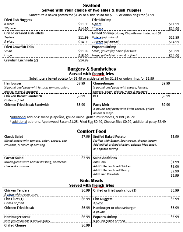 Welcome to Four Tines Restaurant at the Surrey, a gem located in Caldwell, Texas. This delightful dining spot boasts a menu brimming with mouthwatering options that cater to every palate. From perfectly grilled pork chops paired with loaded mashed potatoes to unique sides like fried okra and grilled jalapenos, everyone can find a favorite. The atmosphere is welcoming, with reviews praising both the food and service. Customers, like Marley Cannon and Cassandra W., adore the delicious dishes and friendly staff, creating an inviting space for families and friends alike.
