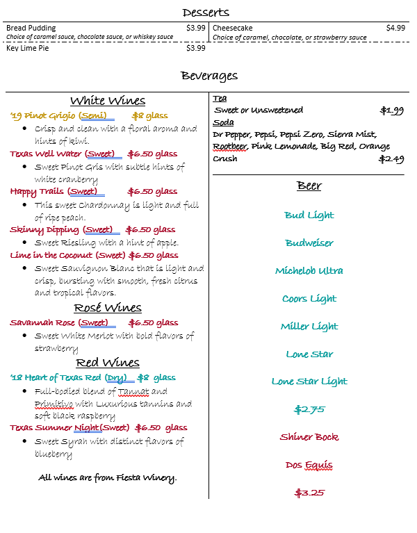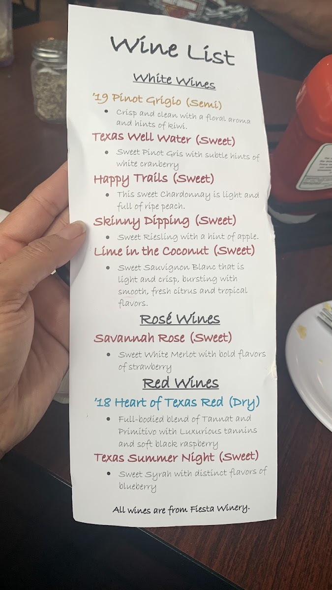Be sure to explore the drink menu, featuring local Red Wines such as 18 Heart Of Texas Red and Texas Summer Night, perfect for complementing your meal. Whether you're visiting for a casual lunch or a family dinner, Four Tines Restaurant promises an exceptional dining experience filled with flavors that linger long after your visit.